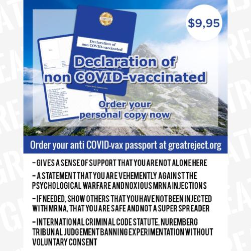 Non-vaccinated declaration and other Freedom Products 1 Comment on Non-vaccinated declaration and other Freedom Products Protect yourself and your family from unconstitutional treatment. These products are now available on our webshop: www.livefree.be/en