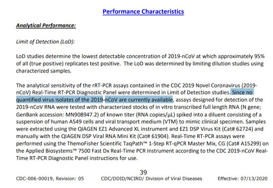 The US National Public Health Service (CDC) also admits that the PCR test was used without any proof of the existence of the coronavirus. On page 39 of a document dated July 13, 2020 and titled “CDC 2019-Novel Coronavirus (2019-nCoV) Real-Time RT-PCR Diagnostic Panel”, the department writes under the heading “Performance Characteristics”: “… because at the time the [PCR] test was designed, there were no quantified isolates available to the CDC […].” This phrase falsely suggests with the word “were” that coronavirus isolates were indeed produced late.